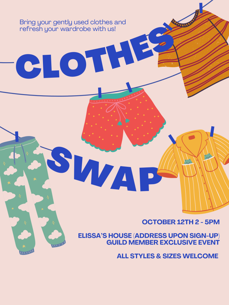 Want to make room in your house for more crafting supplies? Want to refresh your wardrobe sustainably? Bring your gently used clothing and accessories to our Guild Member Clothing Swap event! All styles and sizes are welcome.
